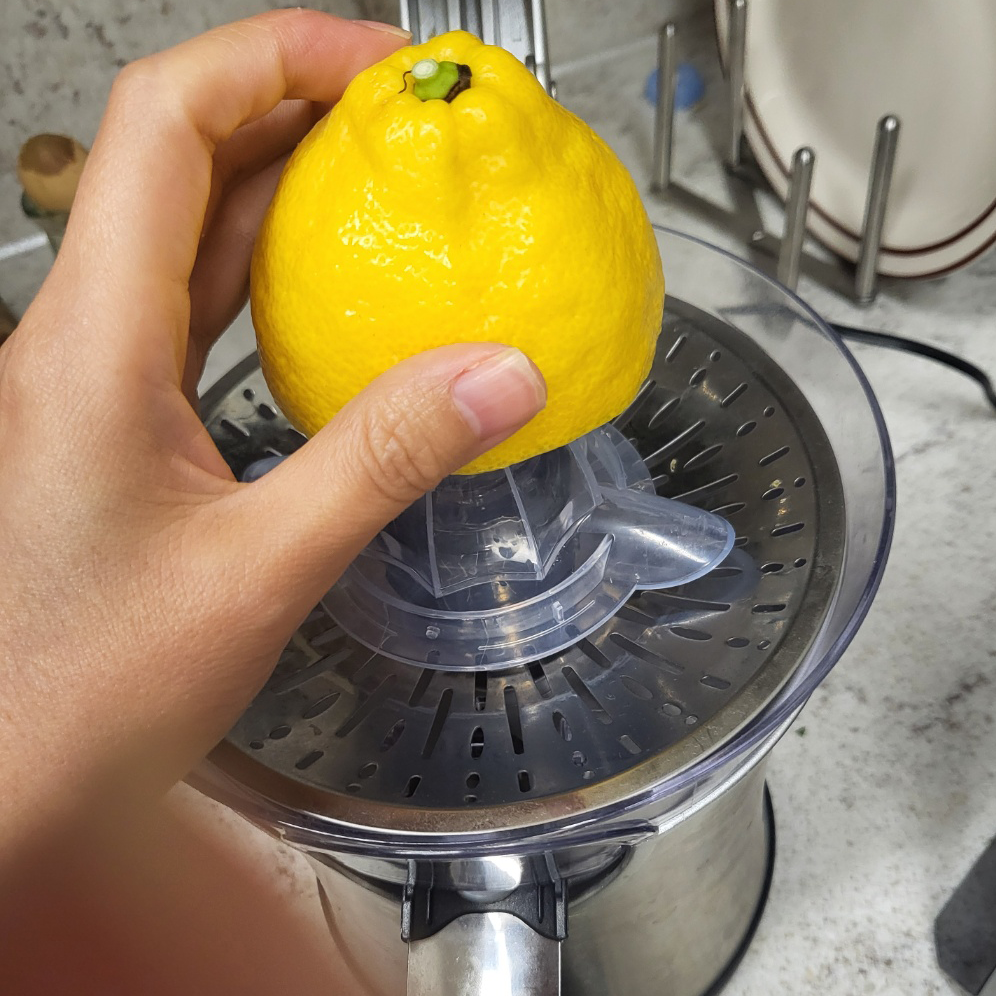 - 반으로 자른 레몬을 스퀴저로 즙을 짜서 물병에 담습니다. (쓴맛이 나는 씨는 제거 합니다. )
