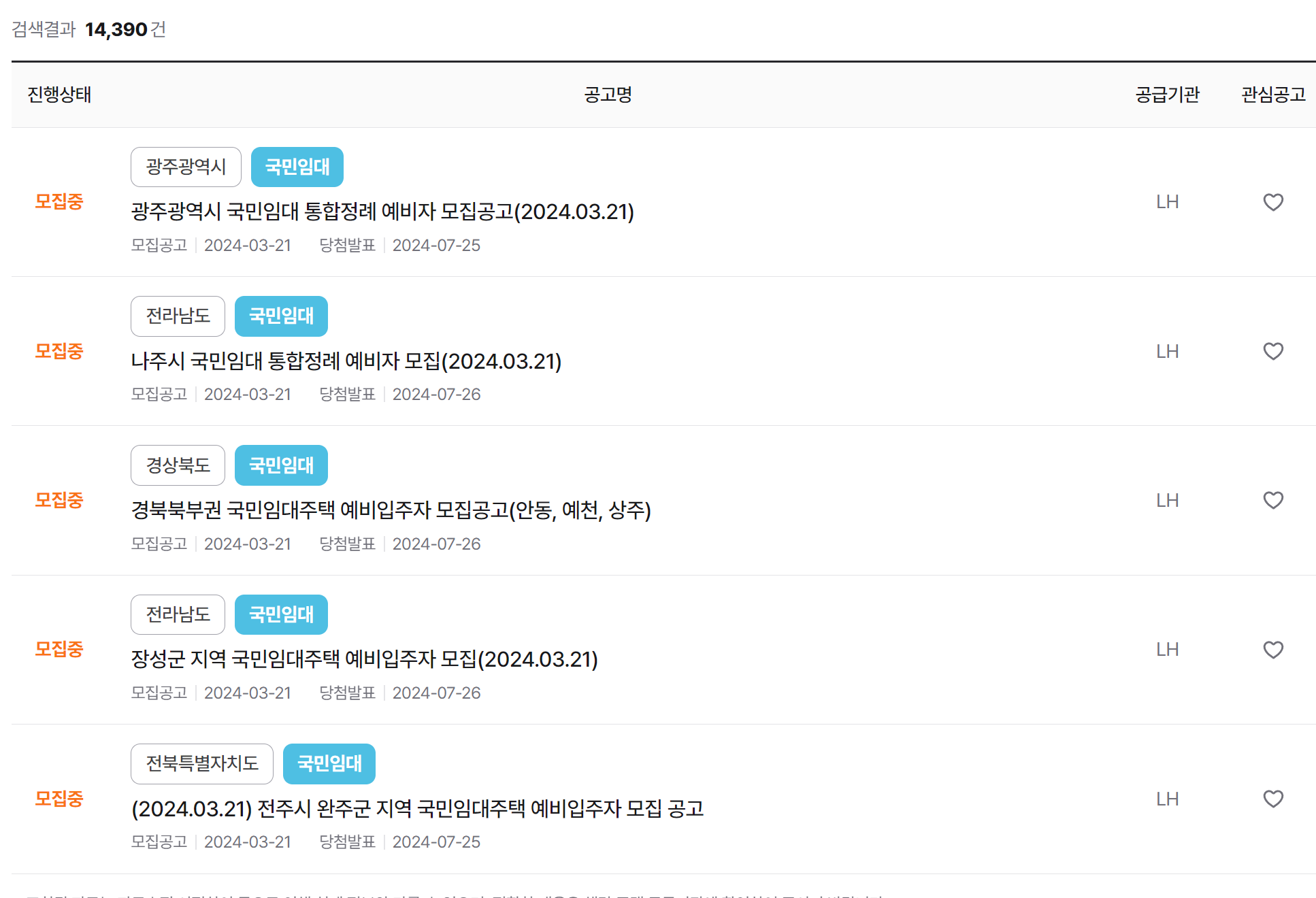 지역별 조회도 가능하며, 검색 후 세부 내용 확인 및 공고 신청을 진행할 수 있습니다.
